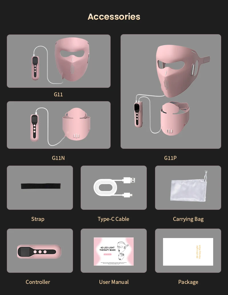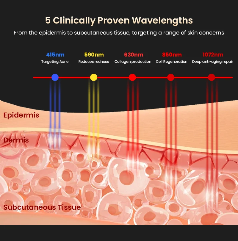• Multi-Wavelength Light Therapy: Blue (415nm), Yellow (590nm), and Near-Infrared (850nm) lights work together to target different skin concerns.