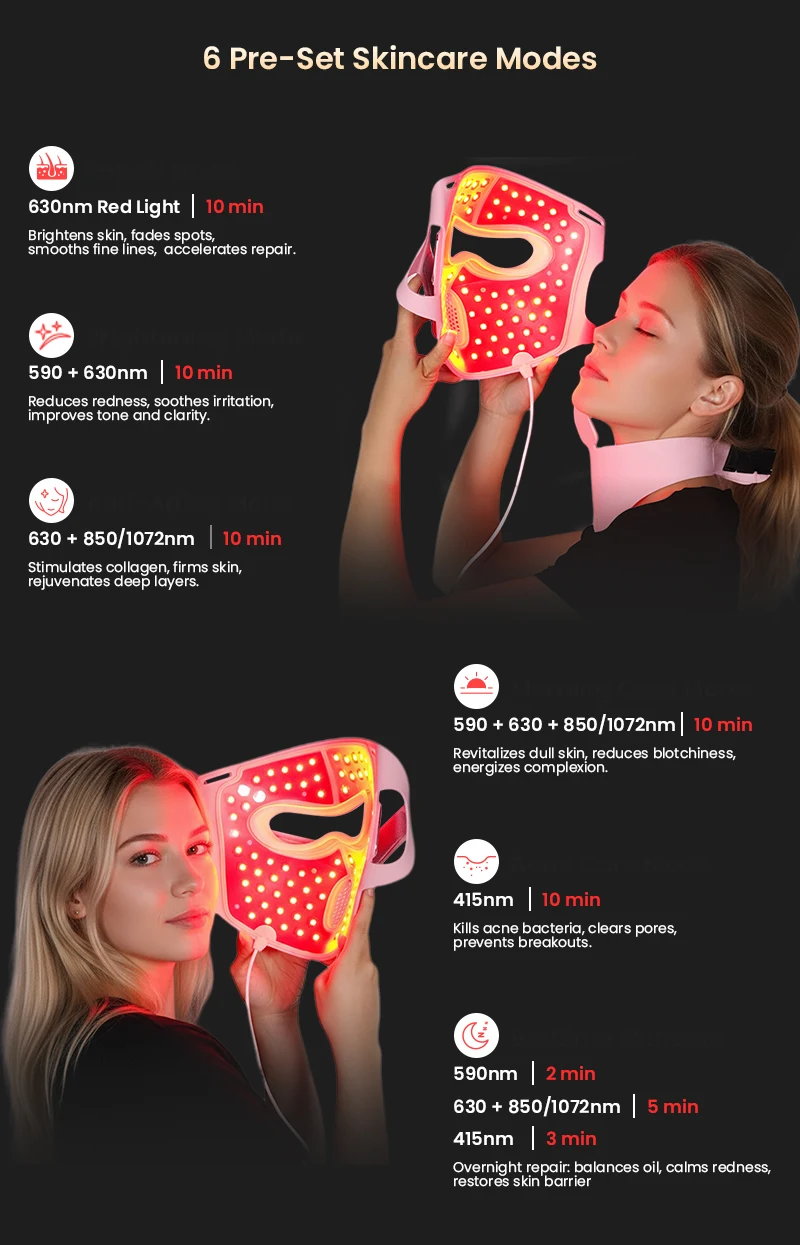 • Six Smart Modes: Repair, Brightening, Anti-Aging, Soothing, Acne Care, and Night Mode.