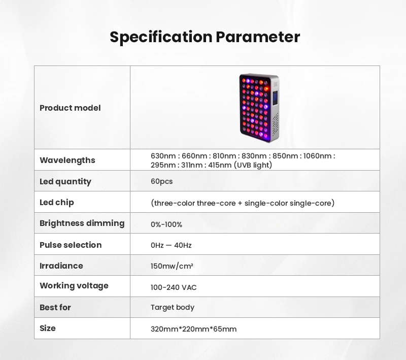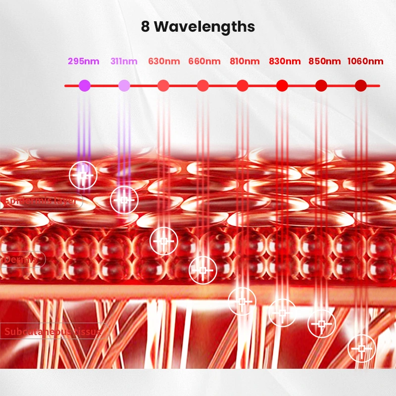 Comprehensive wavelength range – Covers UVB (295nm, 311nm) for psoriasis and vitiligo, blue (415nm) for acne, red (630nm, 660nm) for wound healing and collagen stimulation, near‑infrared (810nm, 830nm, 850nm) for pain relief, and 1060nm for deepest penetration into bones and tendons.